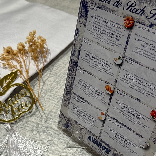 Le seder de Roshashana entièrement décliné sur plexi et sur socle pour poser à table pendant les fêtes.